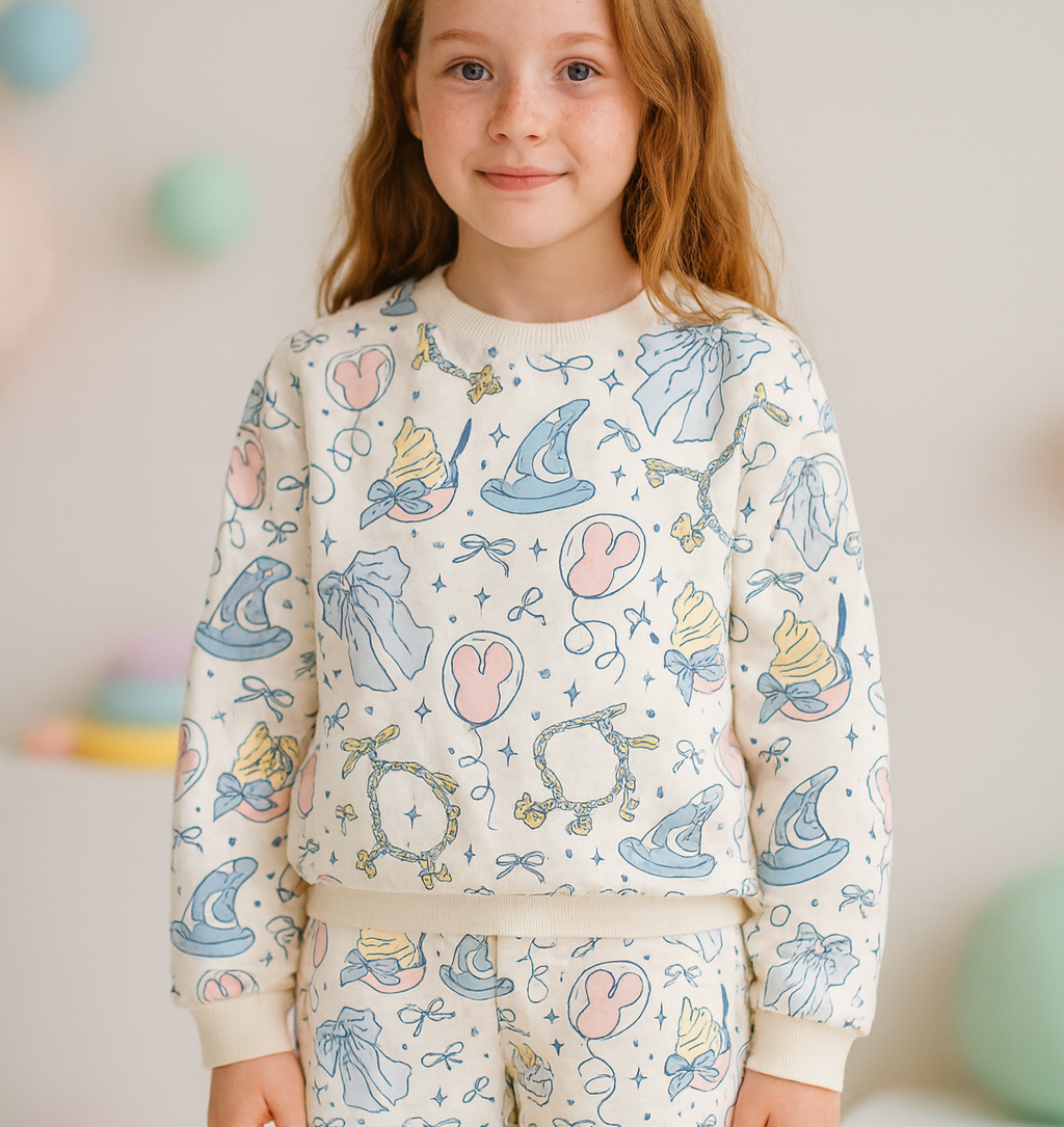 This collection pairs everyday comfort with a touch of magic. This dreamy & magical pastel print brings whimsy and charm to cozy pullovers, easy shorts, soft tees, and premium active wear—made for lounging, moving, and matching with your mini.